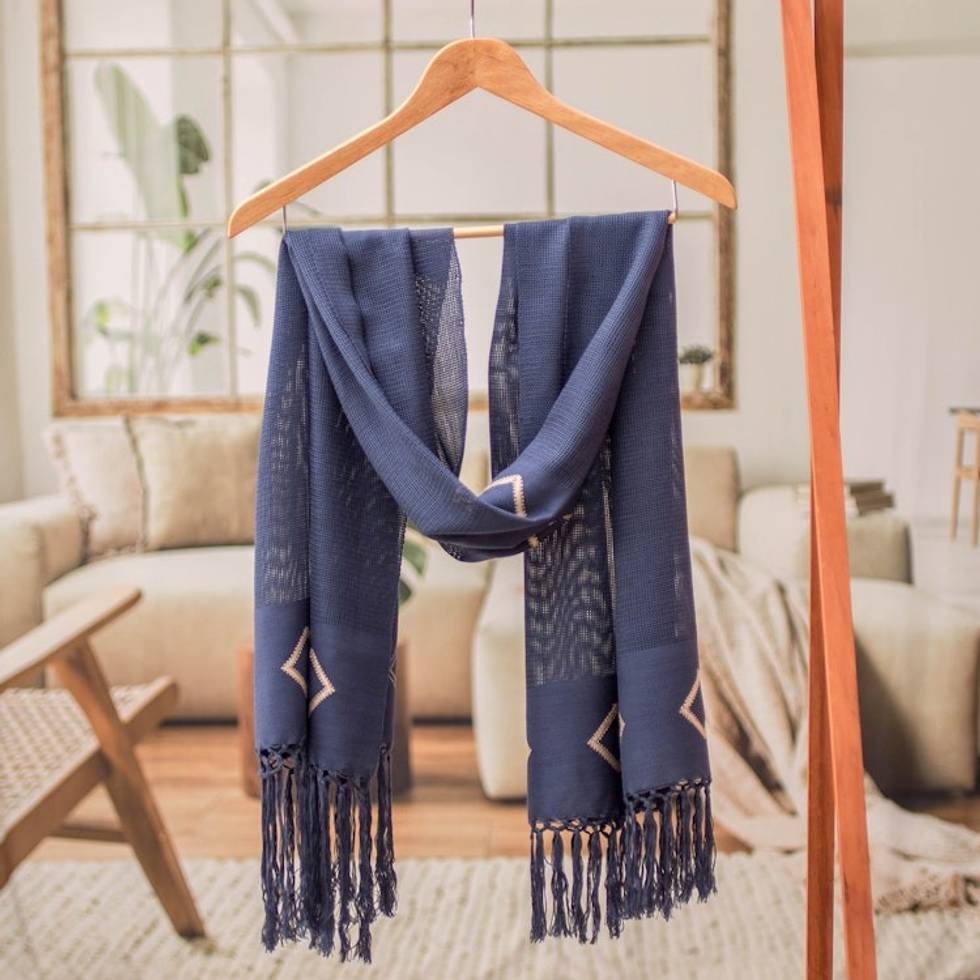 Geometric-Themed Hand-Woven Fringed Cotton Scarf in Blue Hue 'Blue Geometric Charm' Item ID: 2671769023