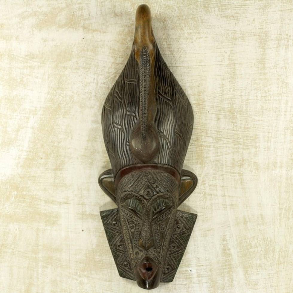 "The Akan word sankofa means 'back to my roots' and is the inspiration for this design. This African mask is made from local materials by Ghanaian artisan Winfred Ansah Okoampah. Using sese wood, aluminum plate, and clay, the artist carves and crafts this beautiful piece. This design features the legendary adrinka symbol depicting two symmetrical birds. The artist completes the mask with intricate detailing and patterning, making this the perfect piece to display on the wall."