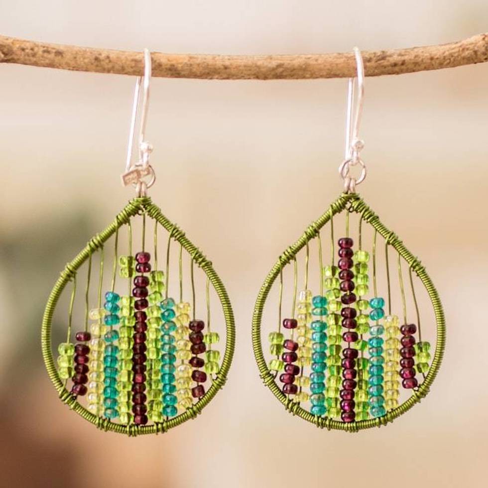 Glass Beaded Dangle Earrings in Green and Purple 'Nature Contrasts' Item ID: 2676659742