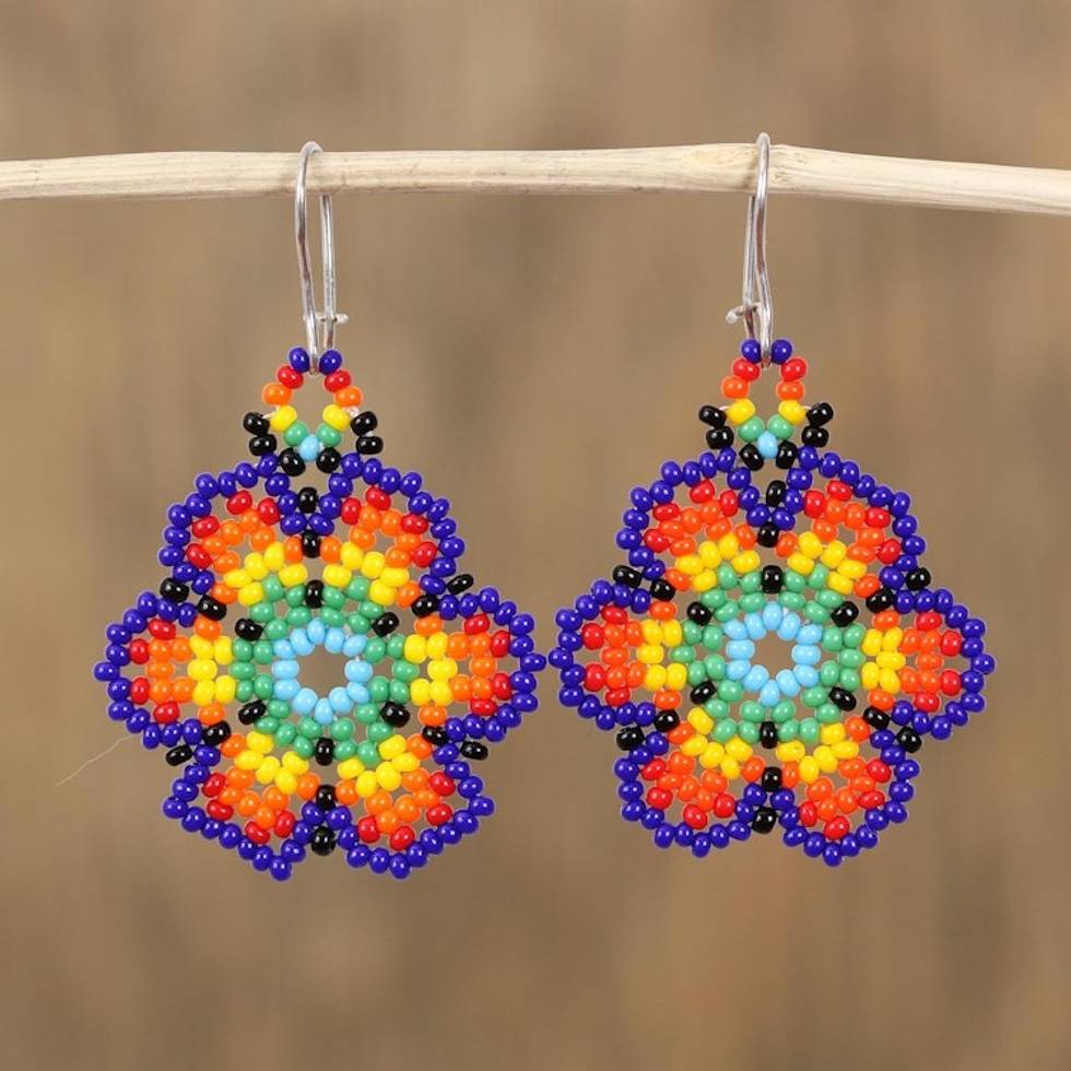 Glass Beaded Floral Dangle Earrings from Mexico 'Floral Colors' Item ID: 2669940063