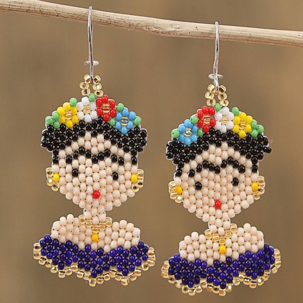 Glass Beaded Frida Dangle Earrings in Blue from Mexico 'Blue Frida' Item ID: 2671809064
