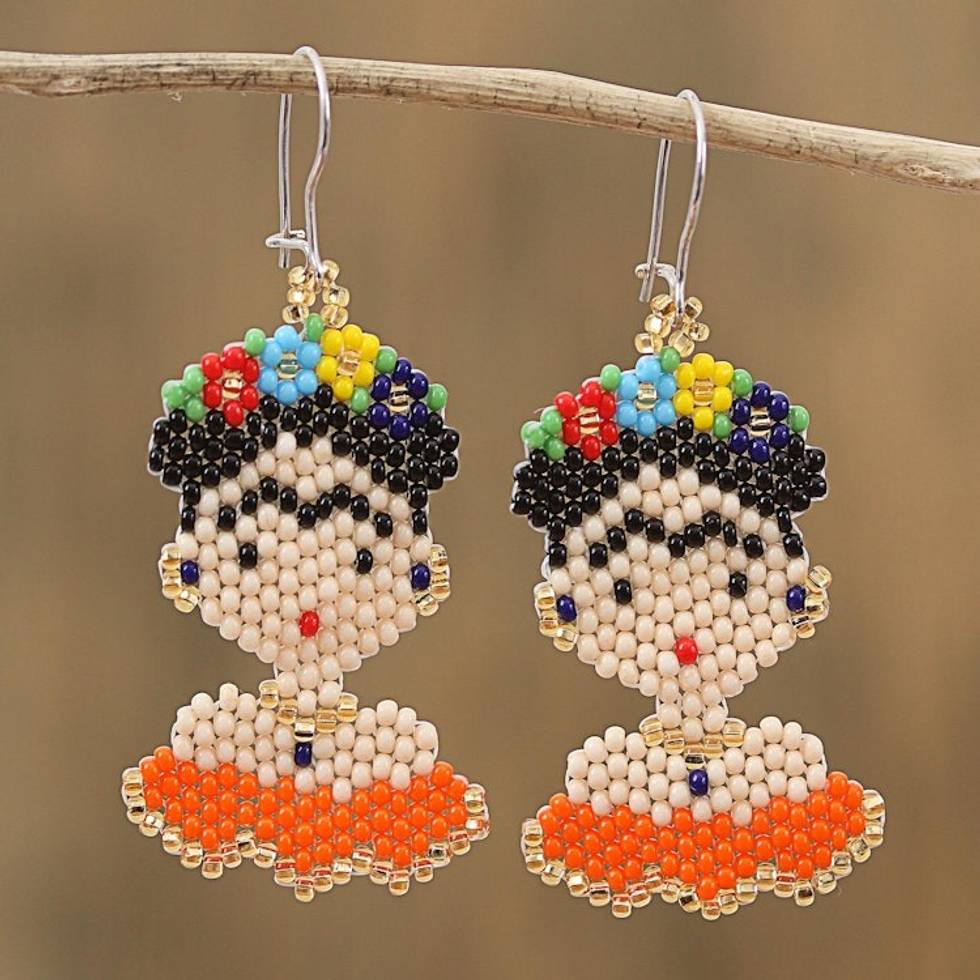 Glass Beaded Frida Dangle Earrings in Orange from Mexico 'Orange Frida' Item ID: 2669931998