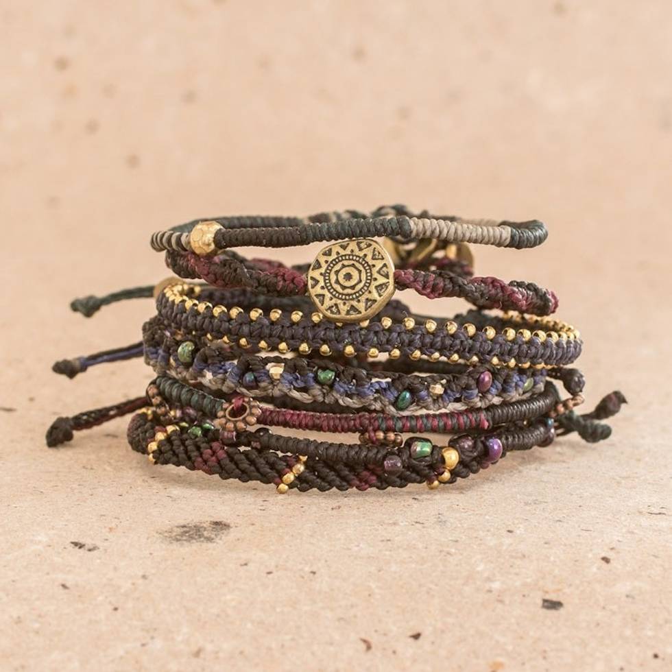 Glass Beaded Macrame Bracelets in Black Set of 7 'Boho Histories in Black' Item ID: 2671626116