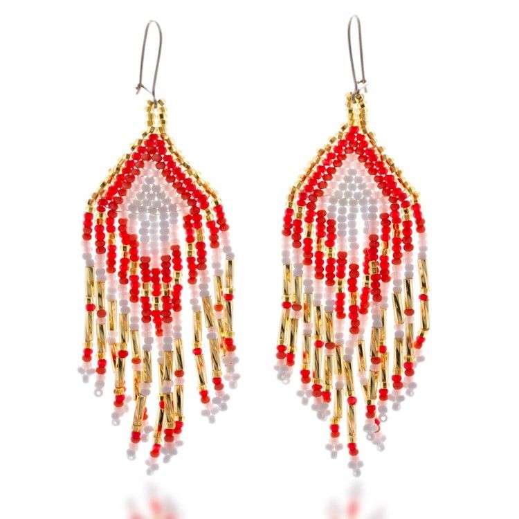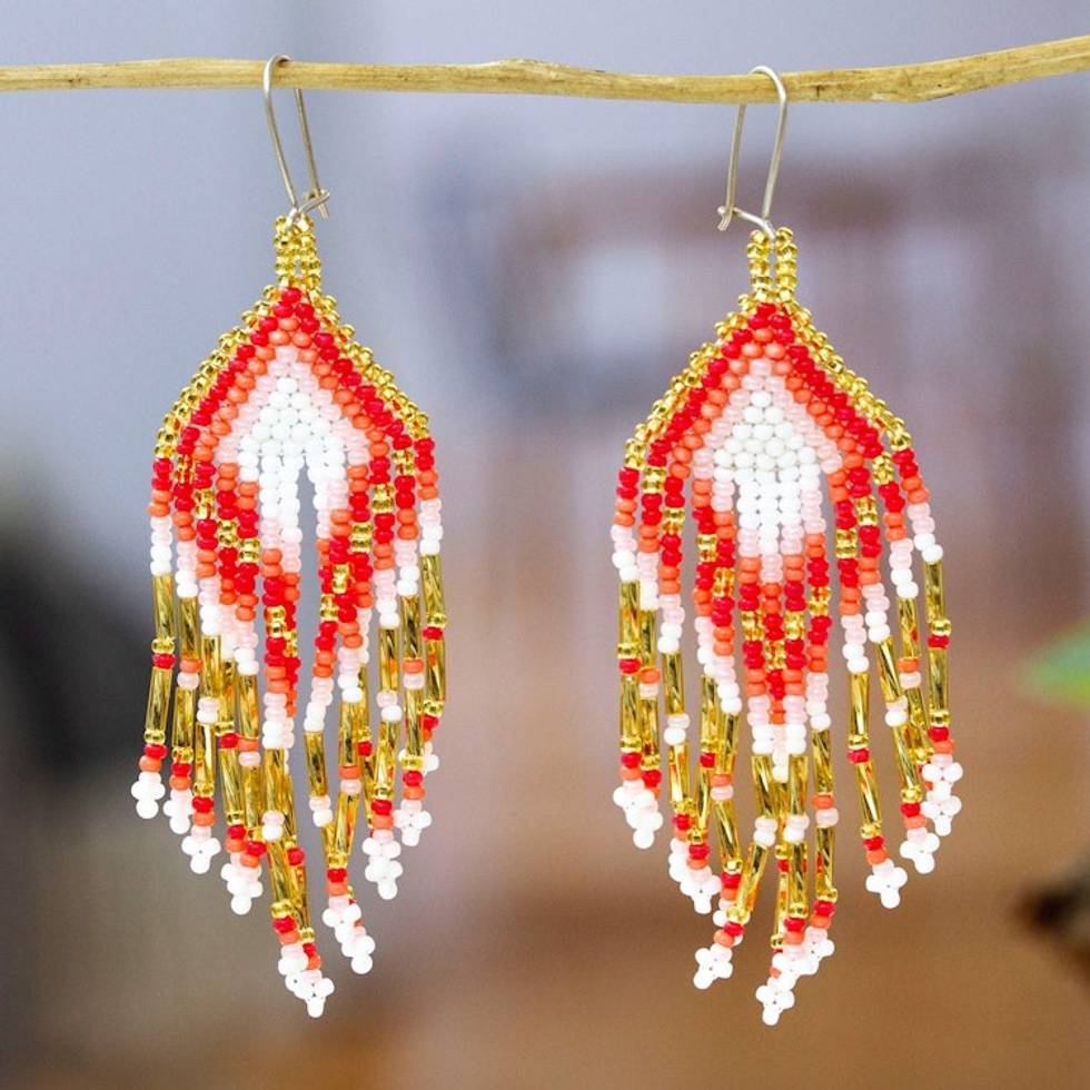 Glass Beaded Waterfall Earrings in Red and Ivory Colors 'Glorious Waterfall' Item ID: 2671800702