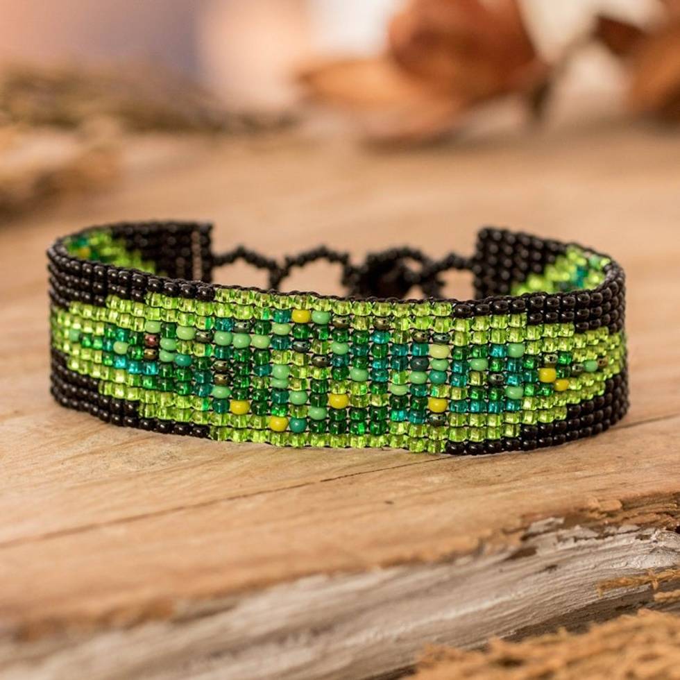 Glass Beaded Wristband Bracelet in Green and Black Hues 'Sylvan Harmony' Item ID: 2671768791
