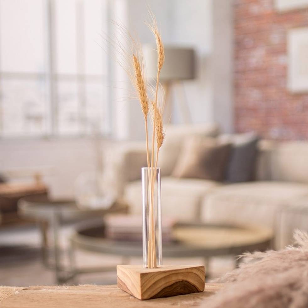 Glass Tube Vase with Teak Wood Stand Made in Guatemala 'Home Glamour' Item ID: 2671626012