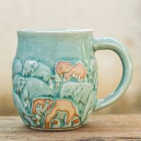 Glazed Celadon Ceramic 10 oz Mug with Brown Accents 'Light Blue Elephant Herd' Item ID: 2671801947