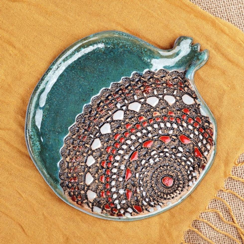 Glazed Green and Red Ceramic Pomegranate Dessert Plate 'Delightful Omen' Item ID: 2669941708