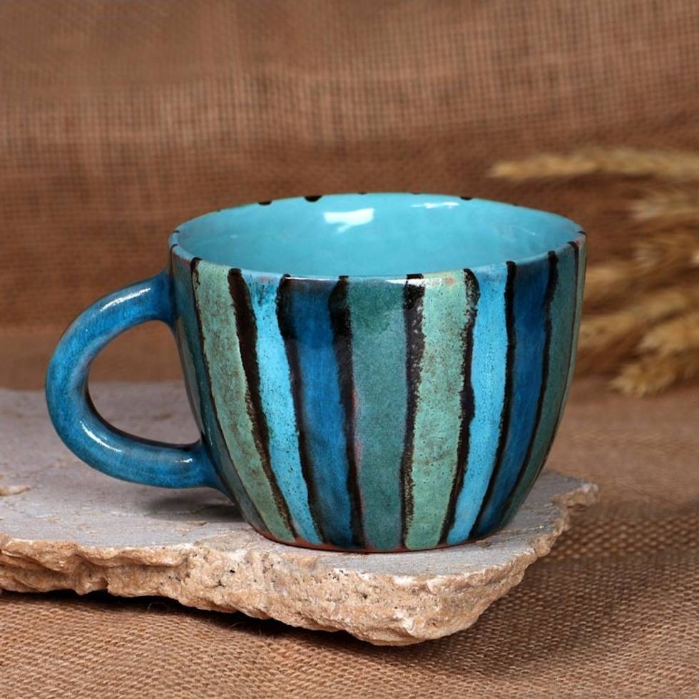 Glazed Striped Blue Ceramic Mug Crafted by Armenian Artisans 'Fates of Blue' Item ID: 2671768788