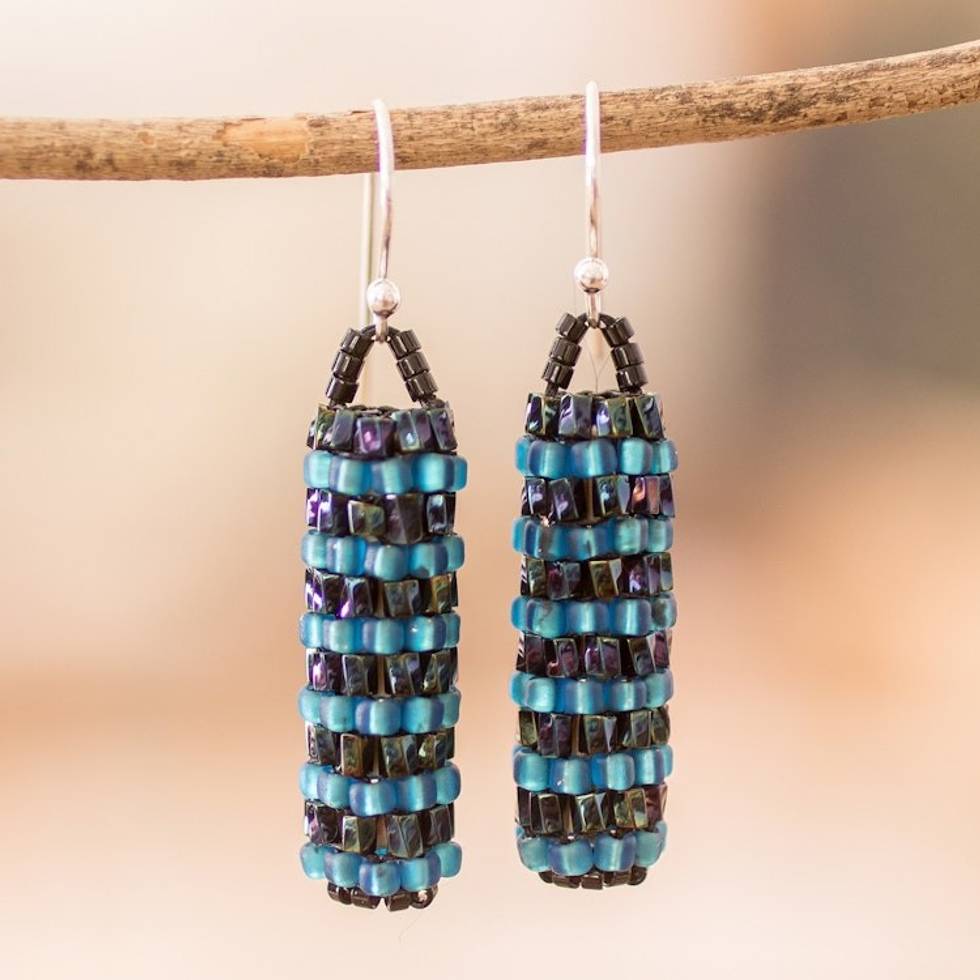 Gleaming Blue Glass Beaded Dangle Earrings from El Salvador 'Ocean Pillars' Item ID: 2671770835