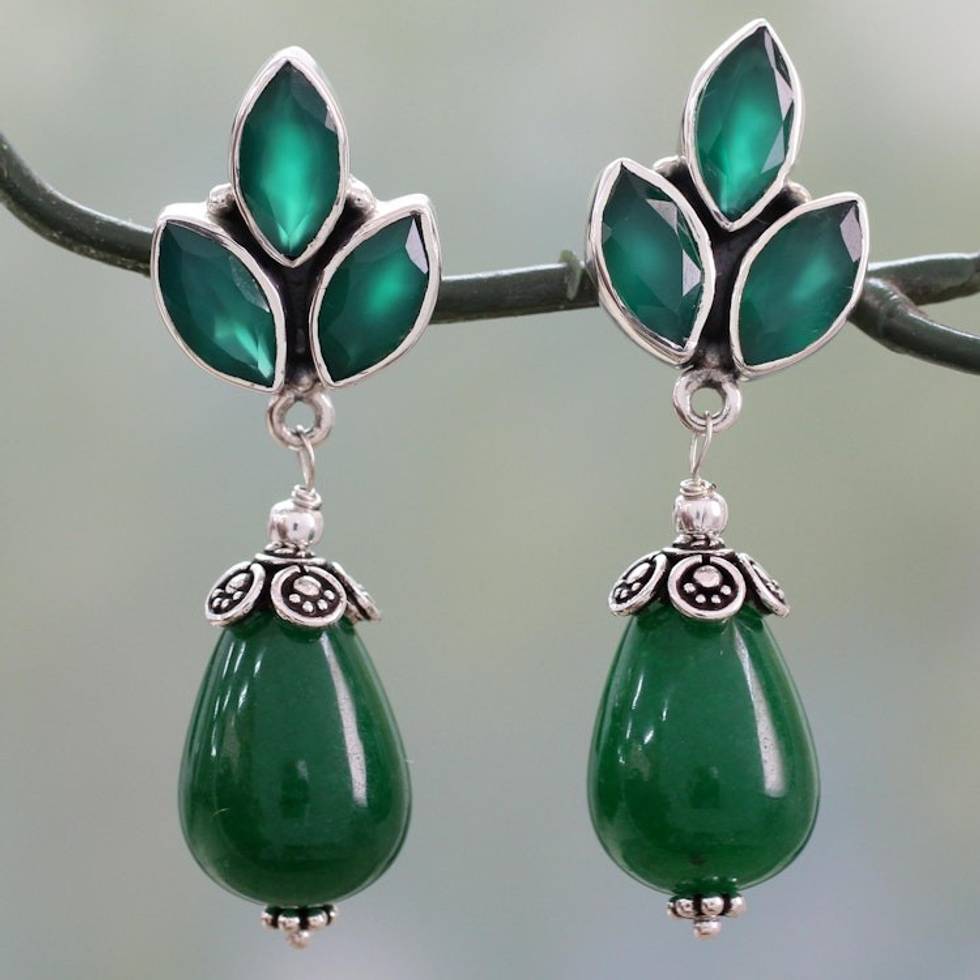 Glossy Green Earrings with Onyx and Chalcedony from India 'Glowing Green' Item ID: 2669924151