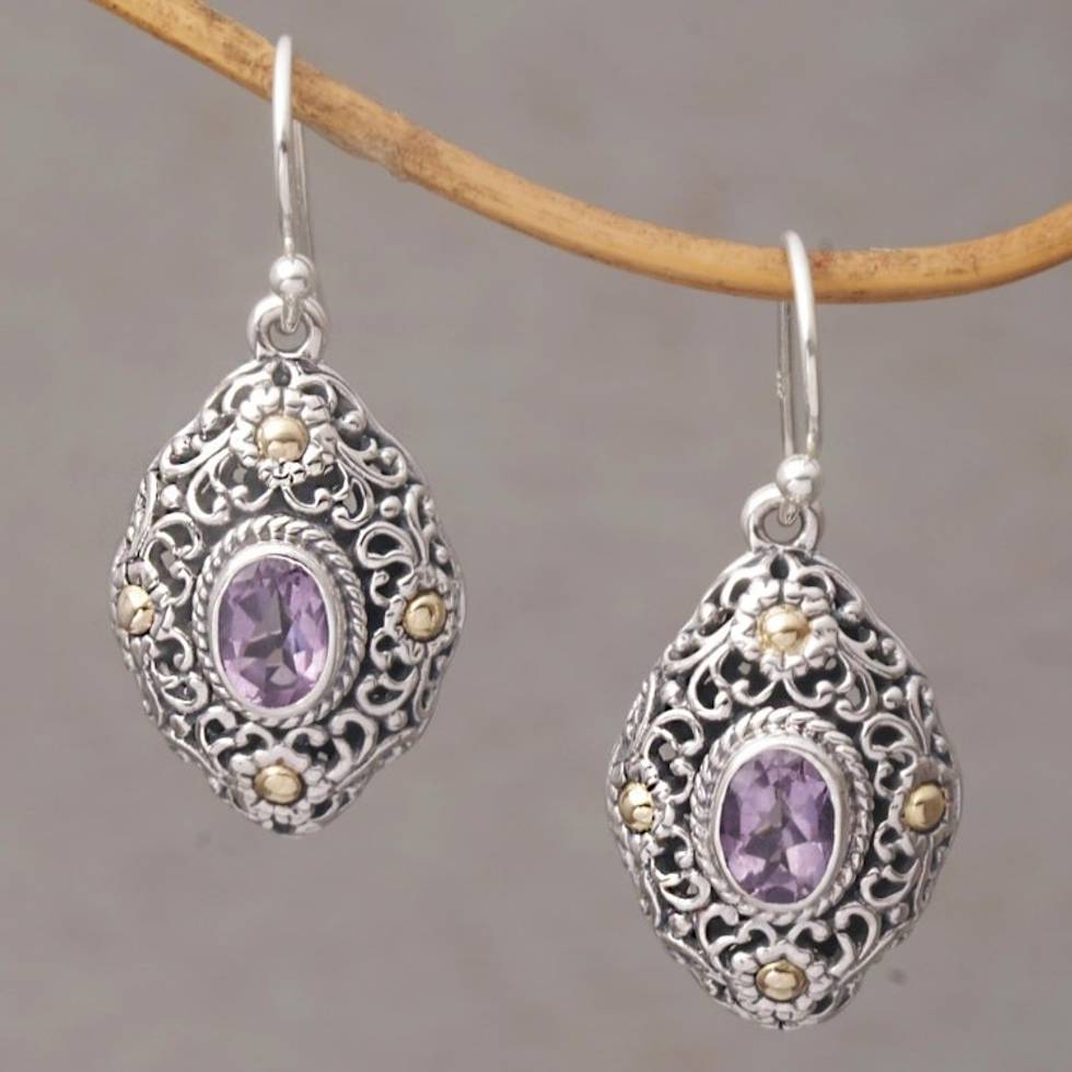 Gold Accent Amethyst Floral Dangle Earrings from Bali 'Floral Dew' Item ID: 2671734304