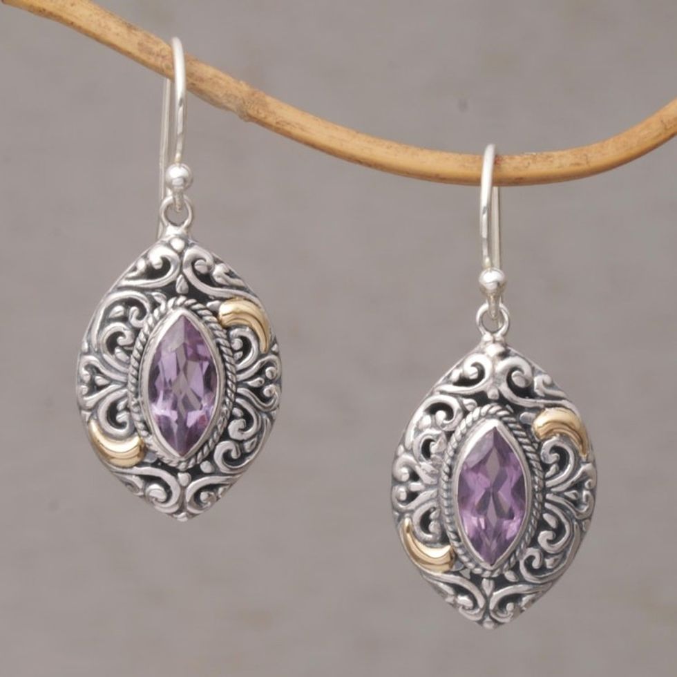 Gold Accent Amethyst Swirl Motif Dangle Earrings from Bali 'Defiant Beauty' Item ID: 2669887413