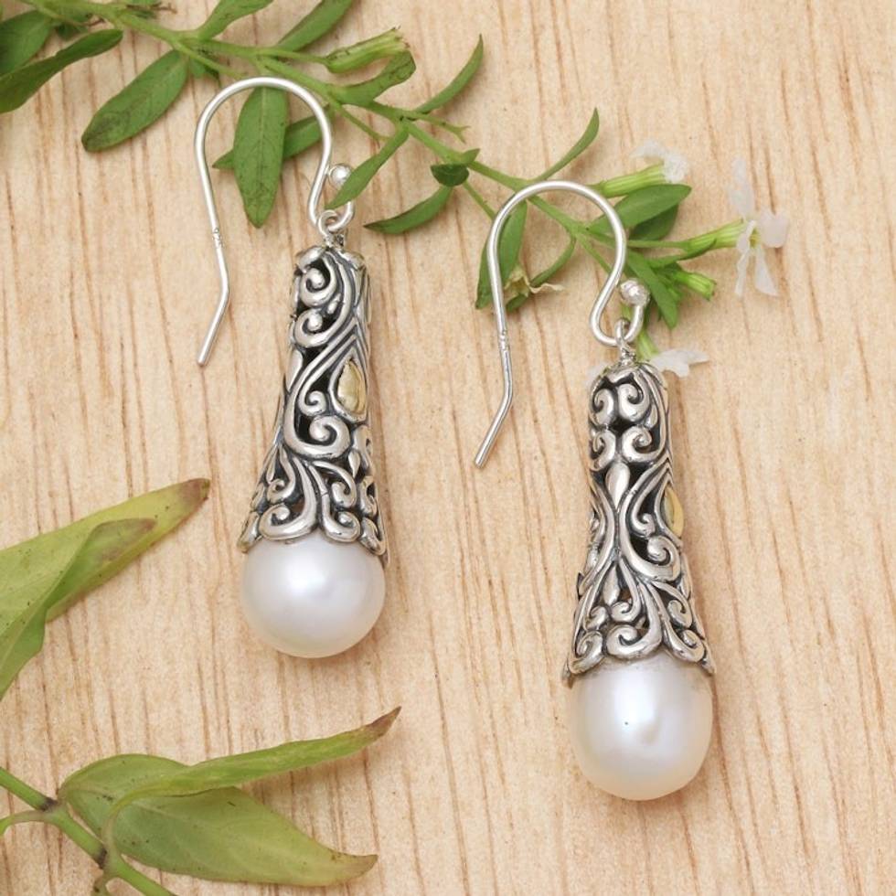 Gold Accent Cultured Pearl Dangle Earrings from Bali 'Dazzling Swirls' Item ID: 2671733388