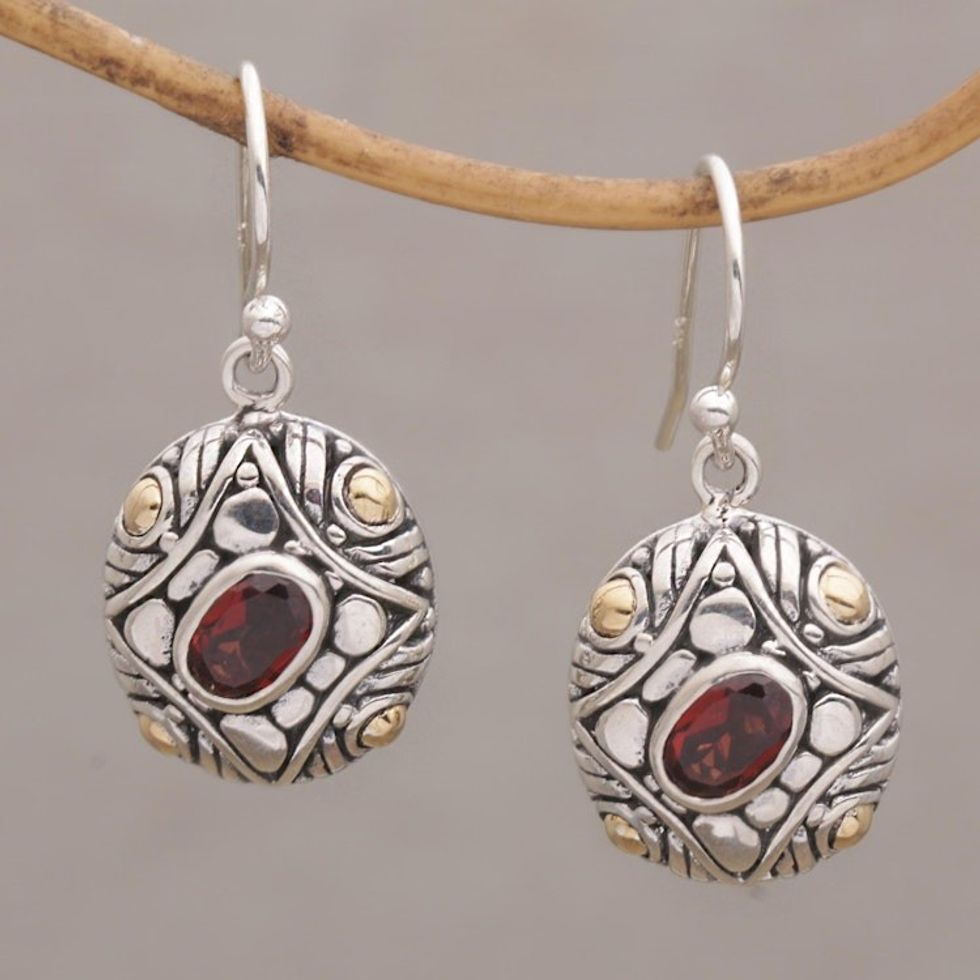 Gold Accent Oval Garnet Dangle Earrings from Bali 'Temple Ovals' Item ID: 2669887234