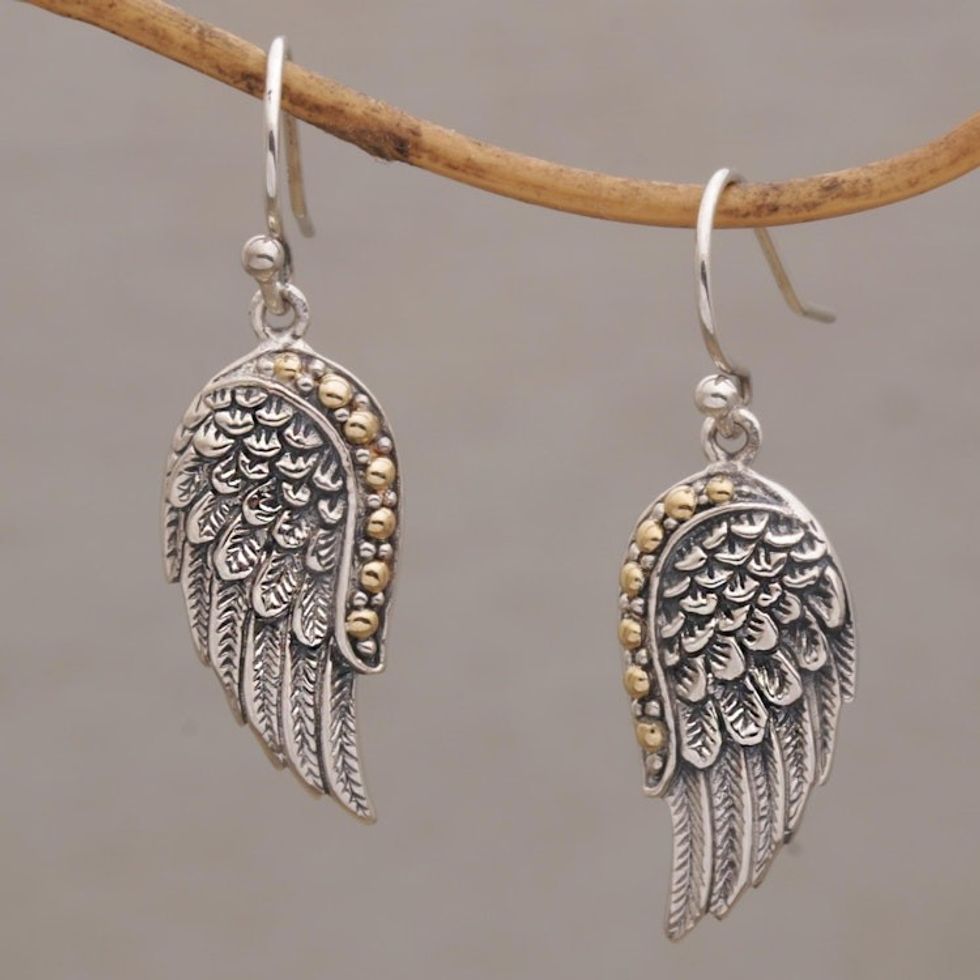Gold Accent Sterling Silver Wing Dangle Earrings from Bali 'Gleaming Swan Wings' Item ID: 2669887184