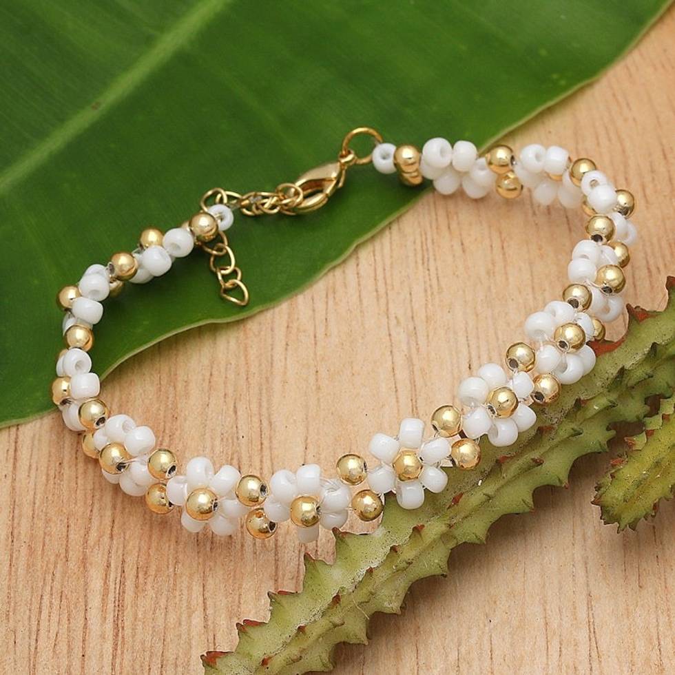 "Transform your everyday look into a head-turning ensemble with this sublime floral wristband bracelet. Harmoniously combining petite white glass beads with lustrous 18k gold-plated brass beads, Balinese artisan Ayu Widiani's exceptional creation is adjustable to your liking thanks to the practical extender chain. This lovely accessory will revolutionize your style with a splash of vibrant elegance and sophistication."