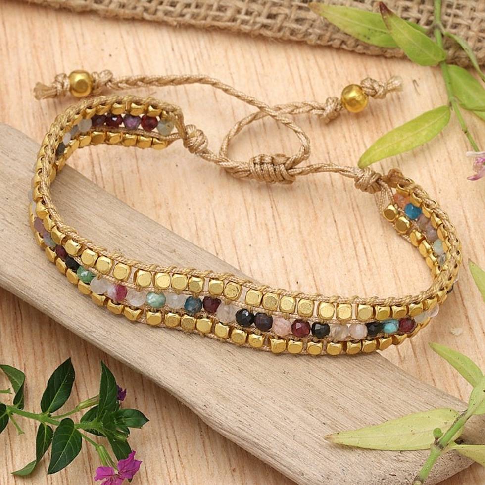"A parade of colorful fluorite stones combined with shiny 18k gold-plated brass beads makes this wristband bracelet an unmistakable showstopper. The delicate beads are expertly arranged on a beige cord boasting a sliding knot closure for a custom fit. Turn heads with Balinese artisan Ayu Widiani's stunning design, seamlessly merging bohemian flair with refined sophistication."