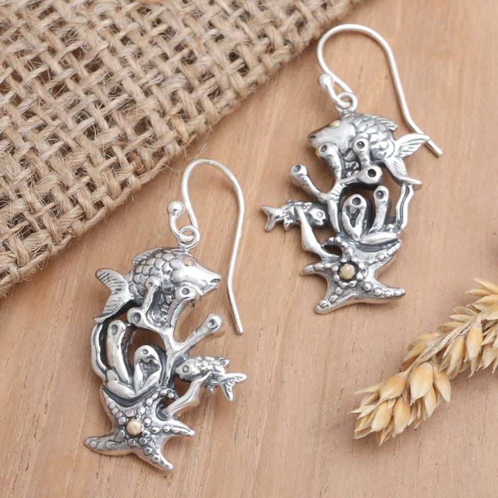 Gold-Accented Dangle Earrings with Sea Life Motif 'Marine Biology' Item ID: 2671748628