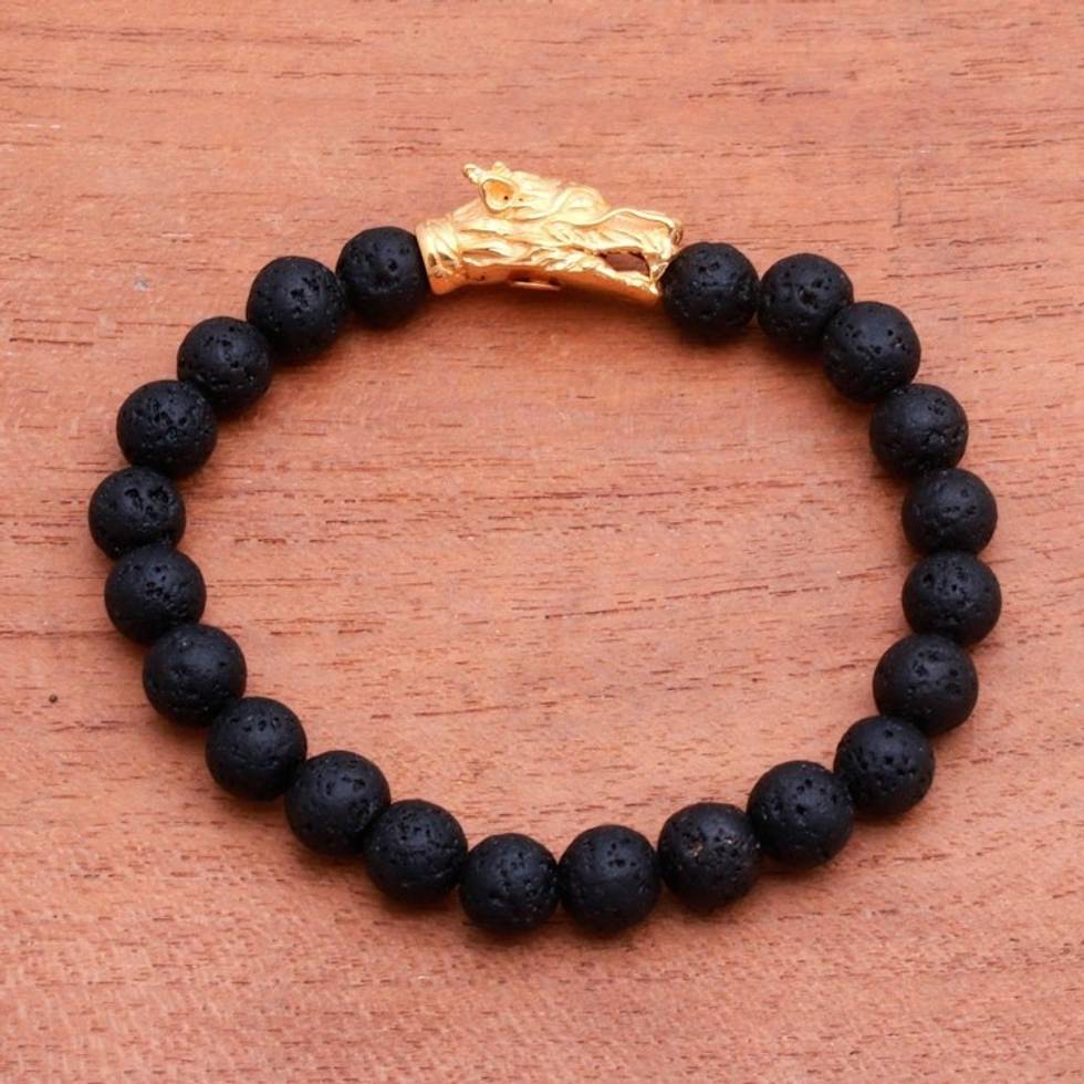Gold Accented Dragon Lava Stone Beaded Stretch Bracelet 'Wise Dragon' Item ID: 2671476358