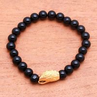 Gold Accented Eagle-Themed Onyx Beaded Stretch Bracelet 'Alert Eagle' Item ID: 2671744991