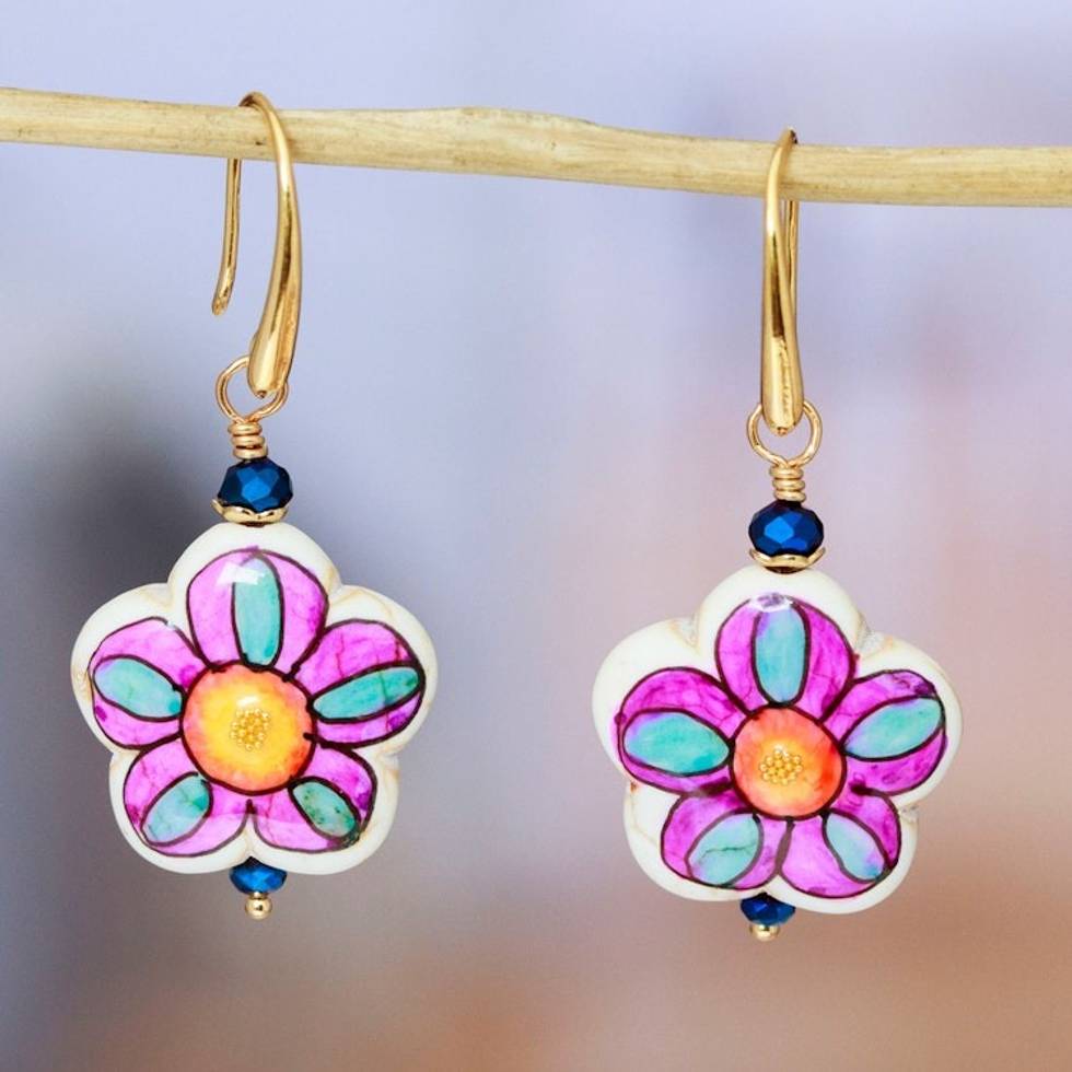 Gold-Accented Floral Howlite Dangle Earrings in Pink Hues 'Kindness Bloom' Item ID: 2671807296
