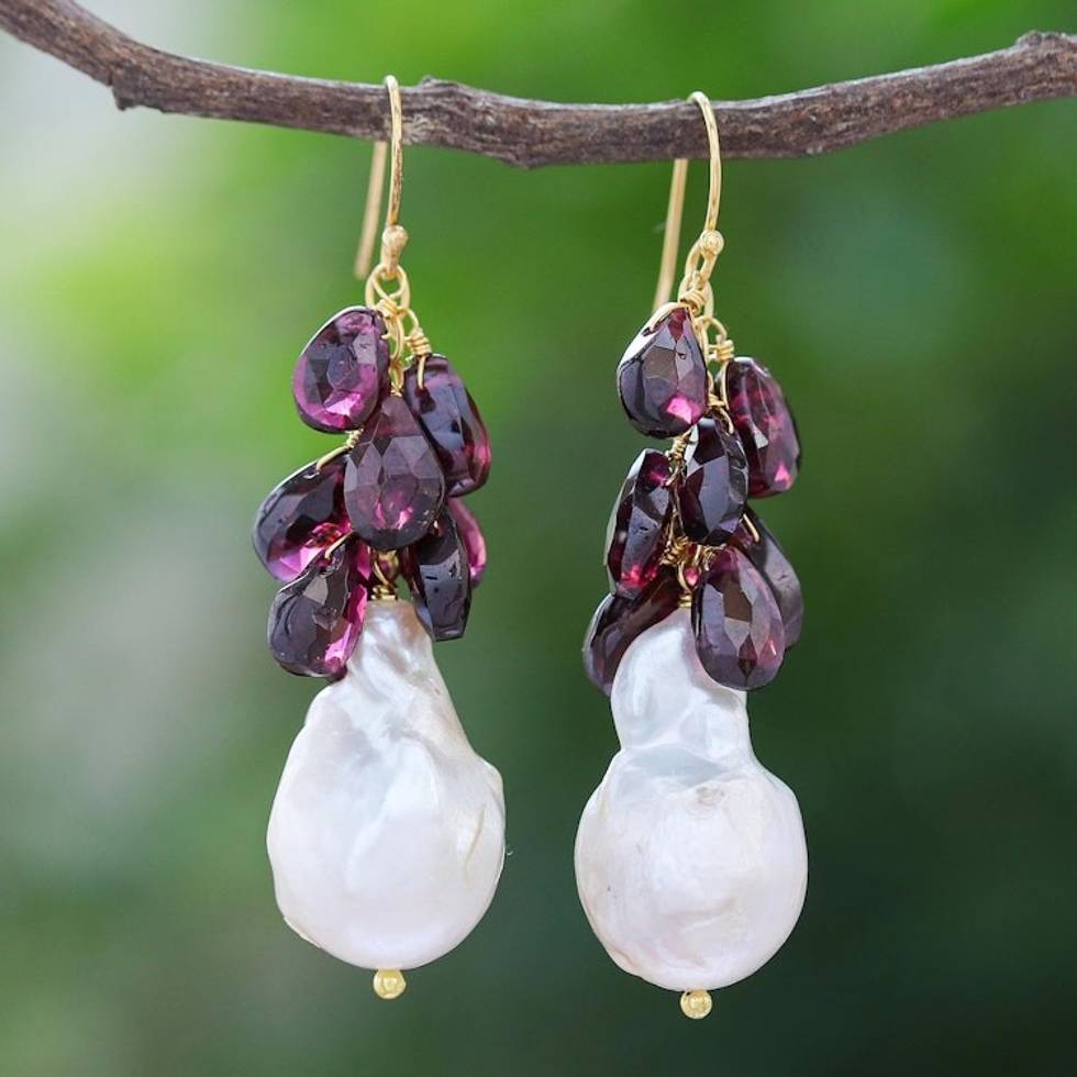 Gold-Accented Garnet and Pearl Dangle Earrings 'Clouded in Red' Item ID: 2671799735