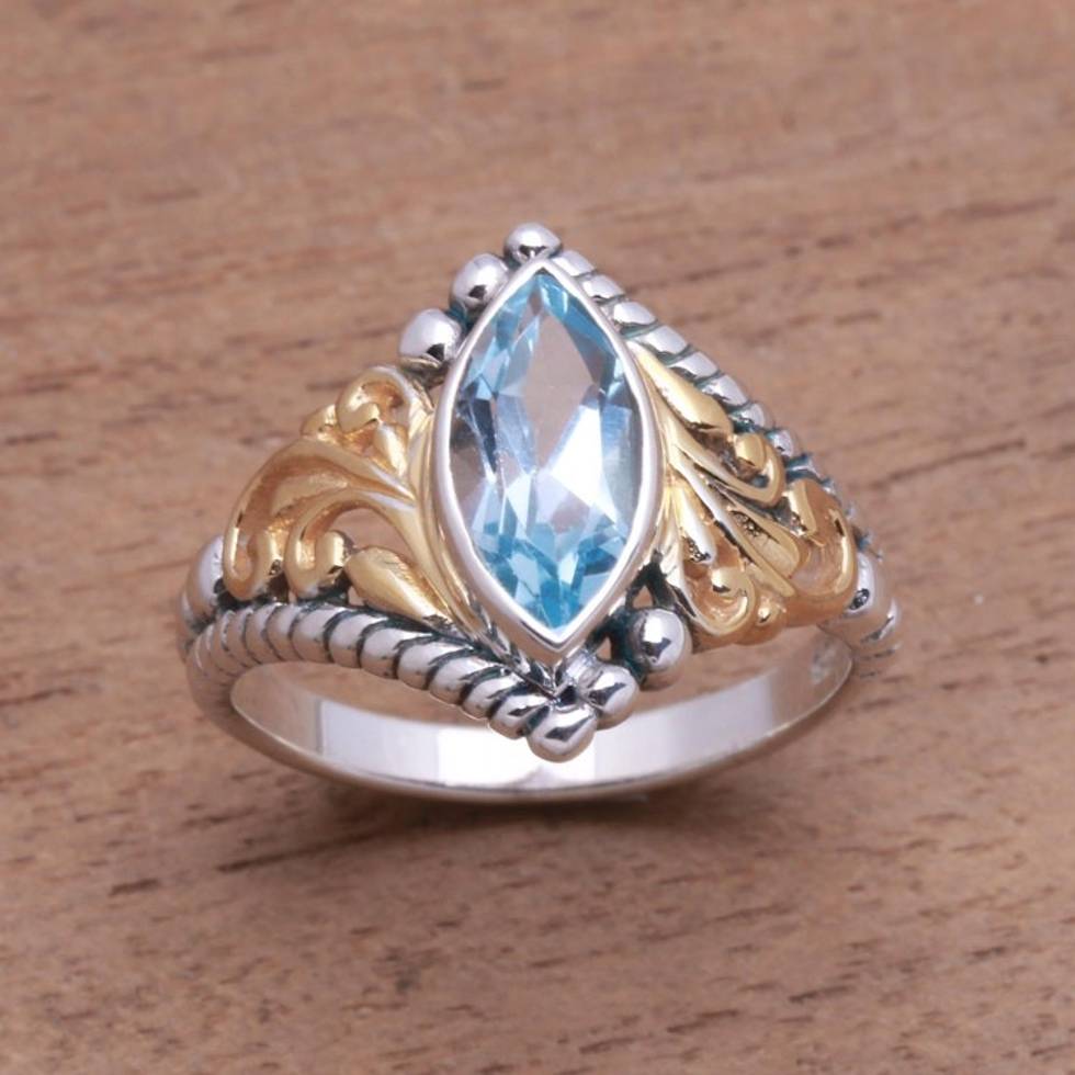 I love this ring I have not taken it off from the moment it was slipped on my finger - it is a true treasure! Such fine workmanship in crafting this design and the combination of gold and silver with the blue topazes is striking - I am very pleased with this ring - Thank you!
