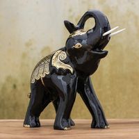"Only the finest materials are fit for Subin Tositarat's royal elephant sculpture, which shimmers with real gold accents. Thai artisans carve the sculpture from raintree wood, coating the gentle beast in glossy black lacquer before describing his attire with 24k gold foil."