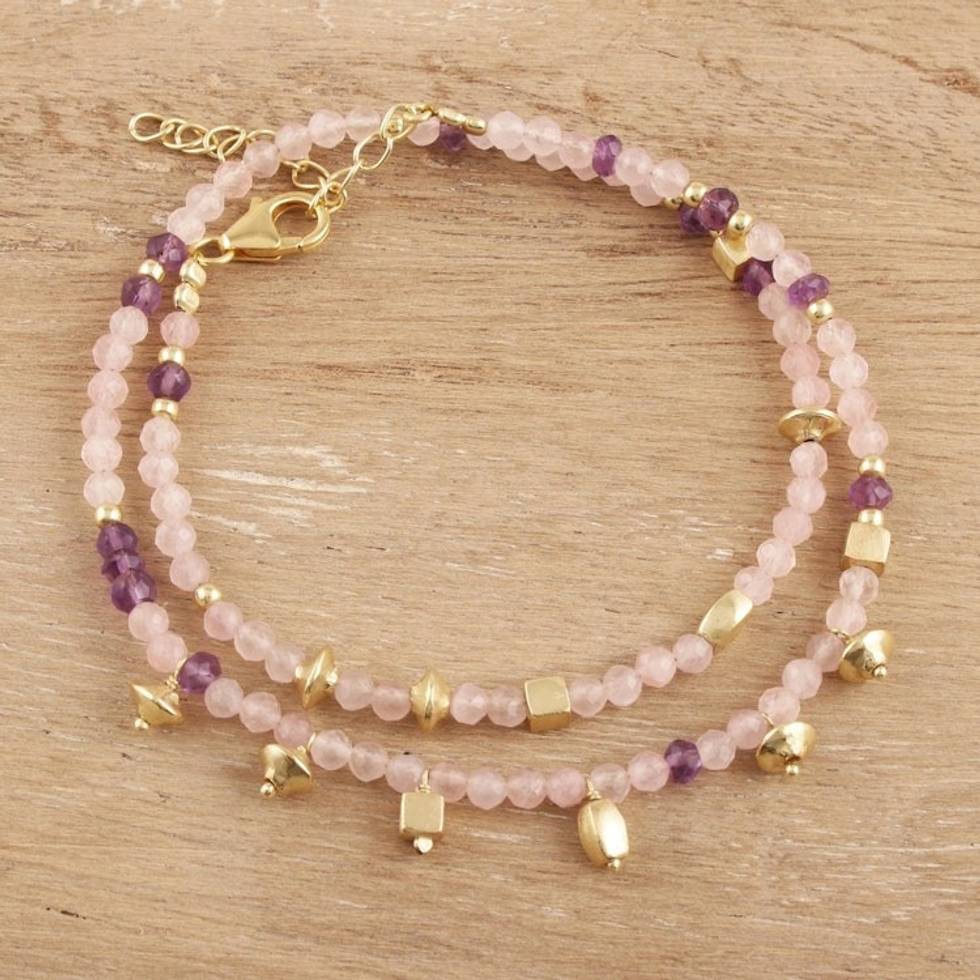 Gold Accented Rose Quartz and Amethyst Beaded Wrap Bracelet 'Fantastic Passion' Item ID: 2671789954