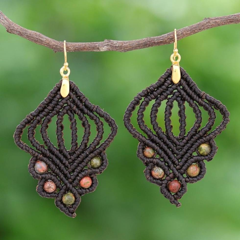 Gold-Accented Unakite Macrame Dangle Earrings 'Hidden Dreams' Item ID: 2671799759
