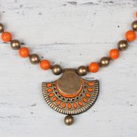 "Orange and gold create a striking combination in this beautiful beaded necklace by Deepti Lav. The pendant celebrates the traditional decorative hand fan, which was used in India as early as 500 B.C. The terracotta is molded into the desired shapes then double fired in a kiln before the artist hand-paints the finer details. A sliding bead closure makes this necklace adjustable in length."