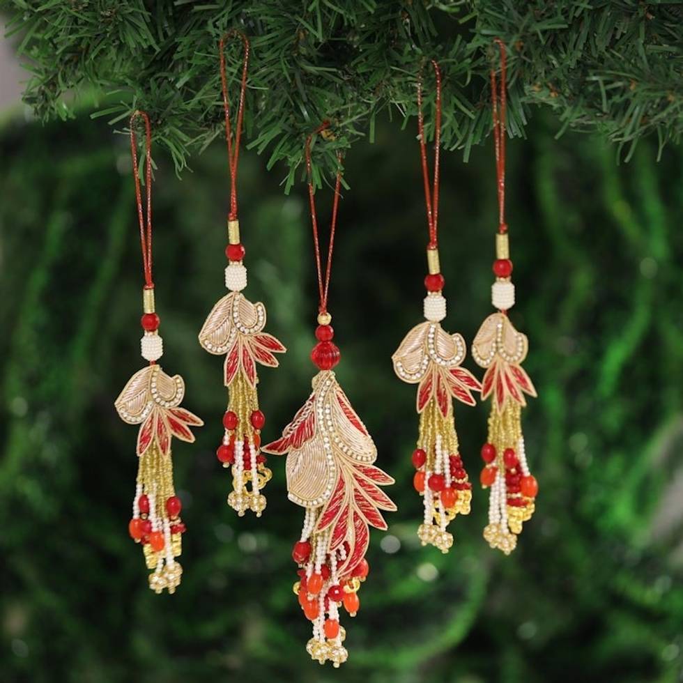 Gold and Red Beaded Ornaments from India Set of 5 'Holiday Gala' Item ID: 2671789880