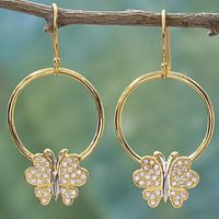 "Brilliant butterfly wings are spread in full display in 18k gold plated sterling silver earrings from Mahavir of India. The earrings showcase sparkling cubic zirconia cut and fitted into textured golden wings and a sterling silver body to add a contrasting glow. The butterflies will fly delightedly as the hoops swing from hooks."