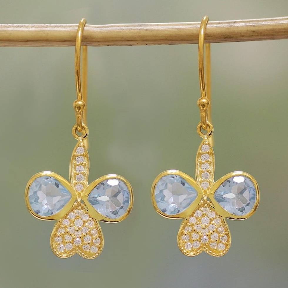 Gold Plated Blue Topaz Butterfly Dangle Earrings from India 'Butterfly Glitter' Item ID: 2671791166