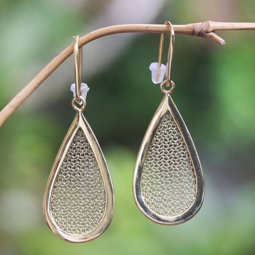 "Gold fans will find something to love on every part of these pear-shaped earrings, designed by Balinese artisans under the watchful eyes of designer Ayu Widiani. The earrings are crafted with a shimmering 18k gold-colored mesh panel that's bordered by a pear-shaped strip of 18k gold-plated brass, while gold-plated brass hooks complete the pair."