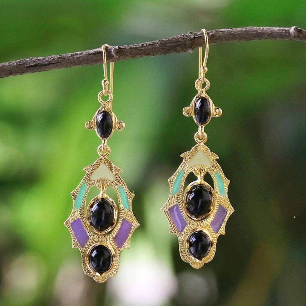 Gold Plated Brass and Resin Colorful Earrings from Thailand 'Ornate Thai' Item ID: 2671801670