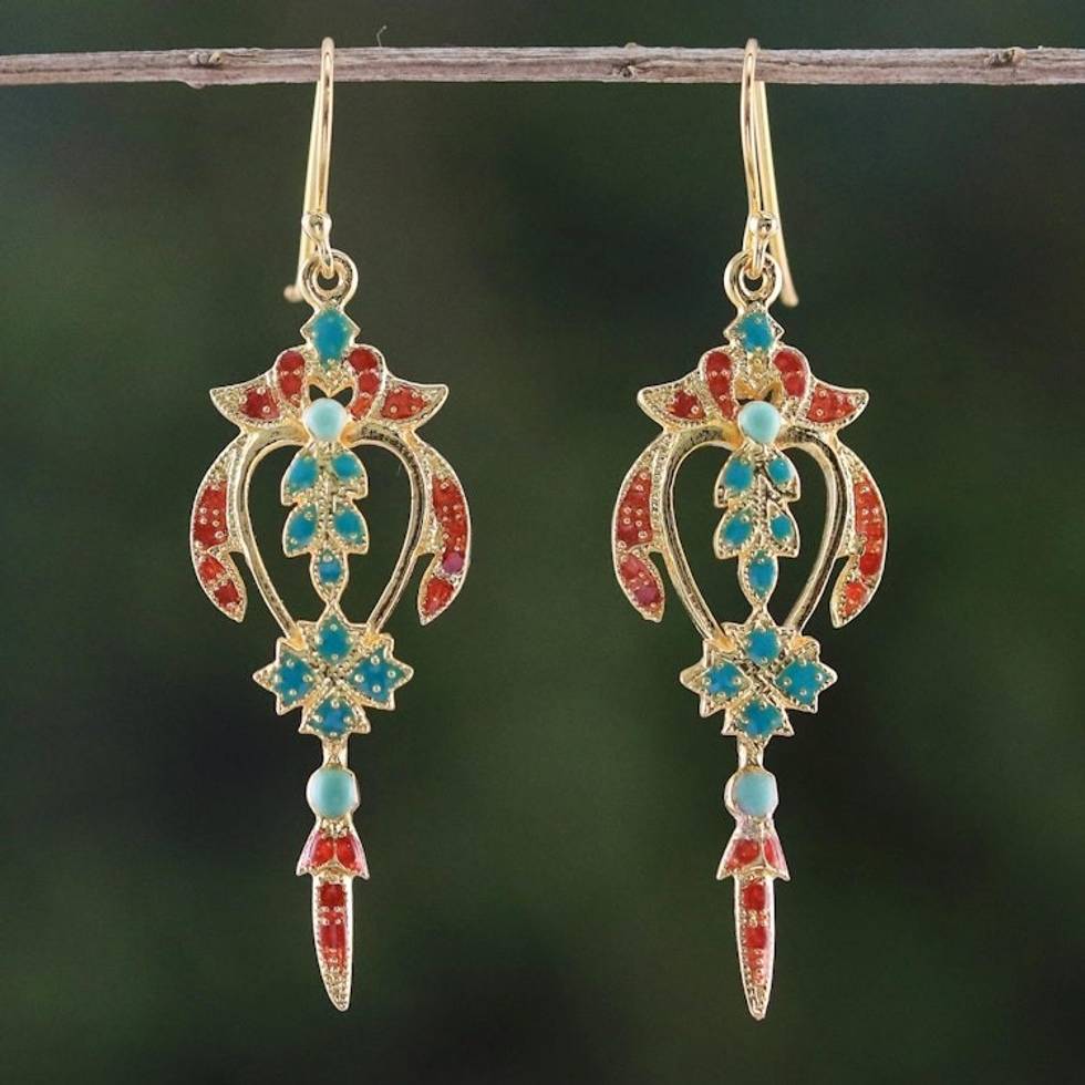 Gold Plated Brass Earrings in Green and Red from Thailand 'Proud Beauty in Red' Item ID: 2671801329