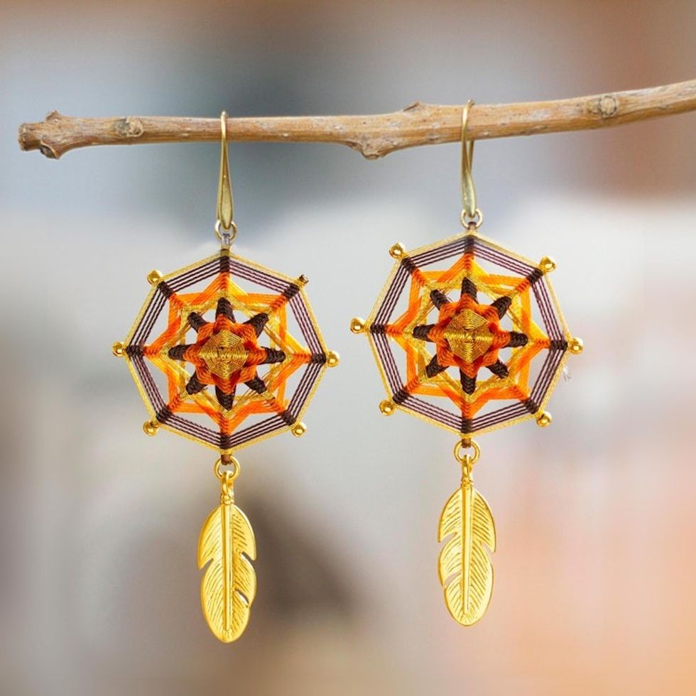Gold-Plated Brass Mandala Dangle Earrings with Feathers 'Feather Mandala' Item ID: 2669932025
