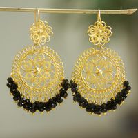 "Working with 10k gold plated copper wire, Donaji Salgado of Mexico creates these pretty filigree chandelier earrings. The earrings are accented with jet-black crystal beads that swing freely from the bottom."