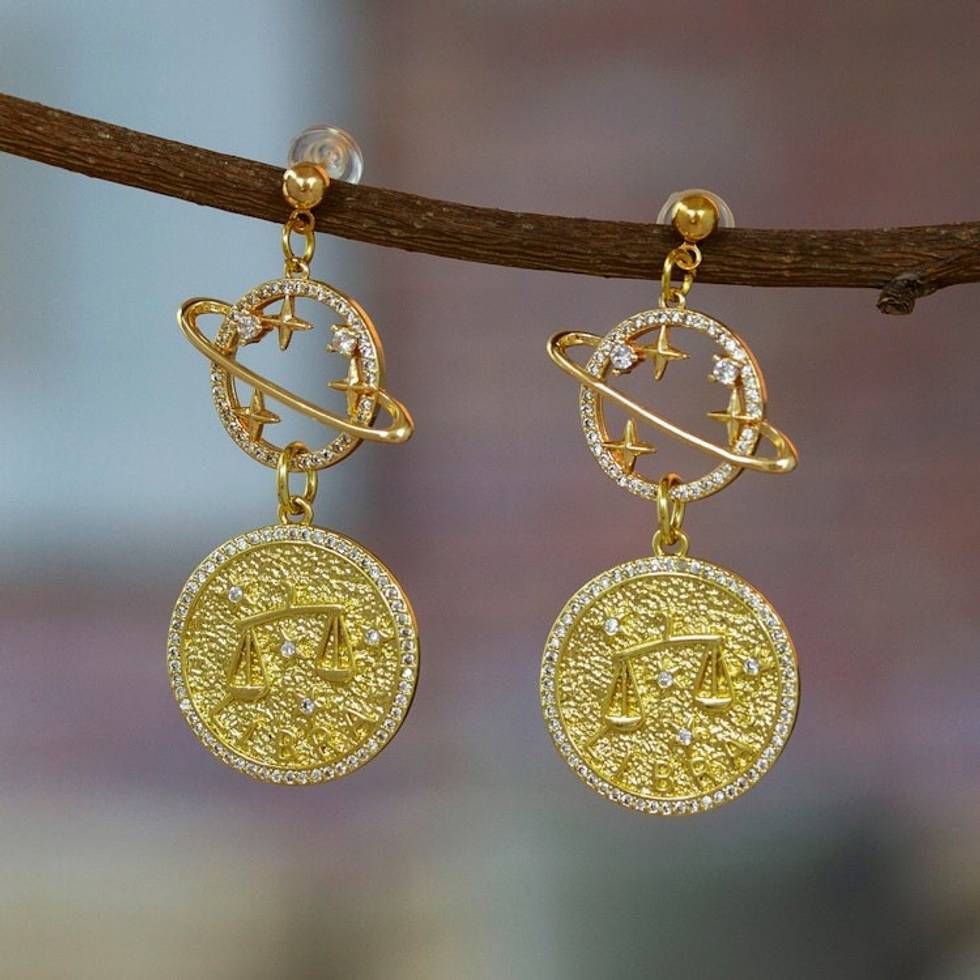 "In Ali Guzman's exquisite craftsmanship, celestial stories unfold. The ancient world believed that the stars inscribed the tapestry of time, influencing destinies as they danced across the heavens. Paying homage to those beliefs, the Mexican artisan's radiant 24k gold-plated brass dangle earrings are adorned with Saturn's cosmic essence that embodies the eternal rhythm of renewal. Harmoniously, Libra's constellation emerges, a radiant symbol of equilibrium, harmony and righteous order. With a luminescent glow, cubic zirconia gems shimmer as if reflecting the very quintessence of the universe itself."