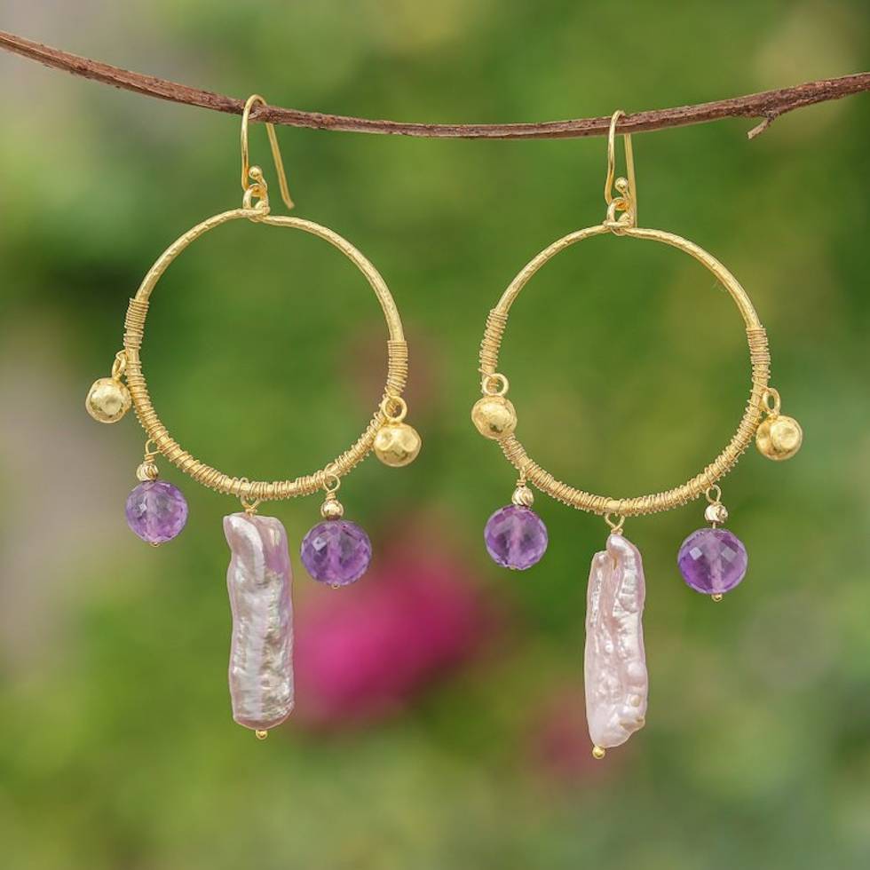 Gold-Plated Cultured Pearl and Amethyst Statement Earrings 'Pop of Purple' Item ID: 2671796761
