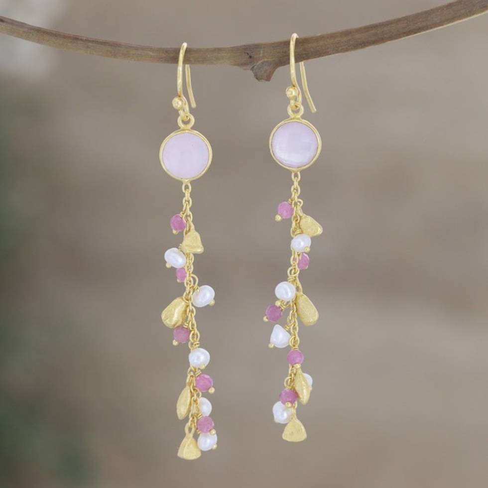 Gold-Plated Cultured Pearl and Chalcedony Dangle Earrings 'Pink Sea' Item ID: 2671787255