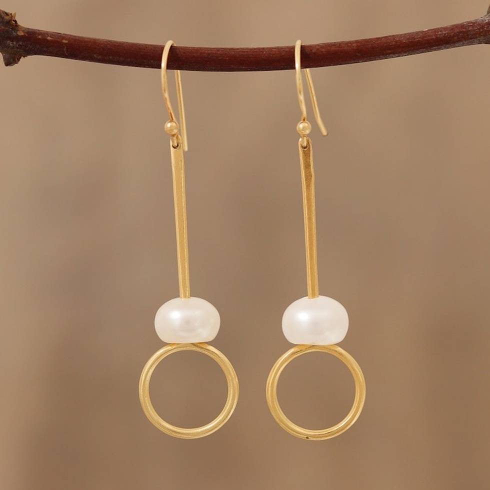 Gold Plated Cultured Pearl Dangle Earrings from India 'Ring Glow' Item ID: 2671619170