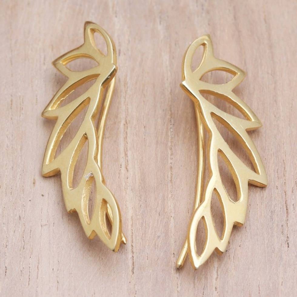 "Designed by Yustiana Dewi in Bali, these adorable ear climber earrings are an easy way to look your best. Balinese artisans use shimmering 18k gold-plated sterling silver to create the leaf motif, hand crafting the design with elegant, openwork details."