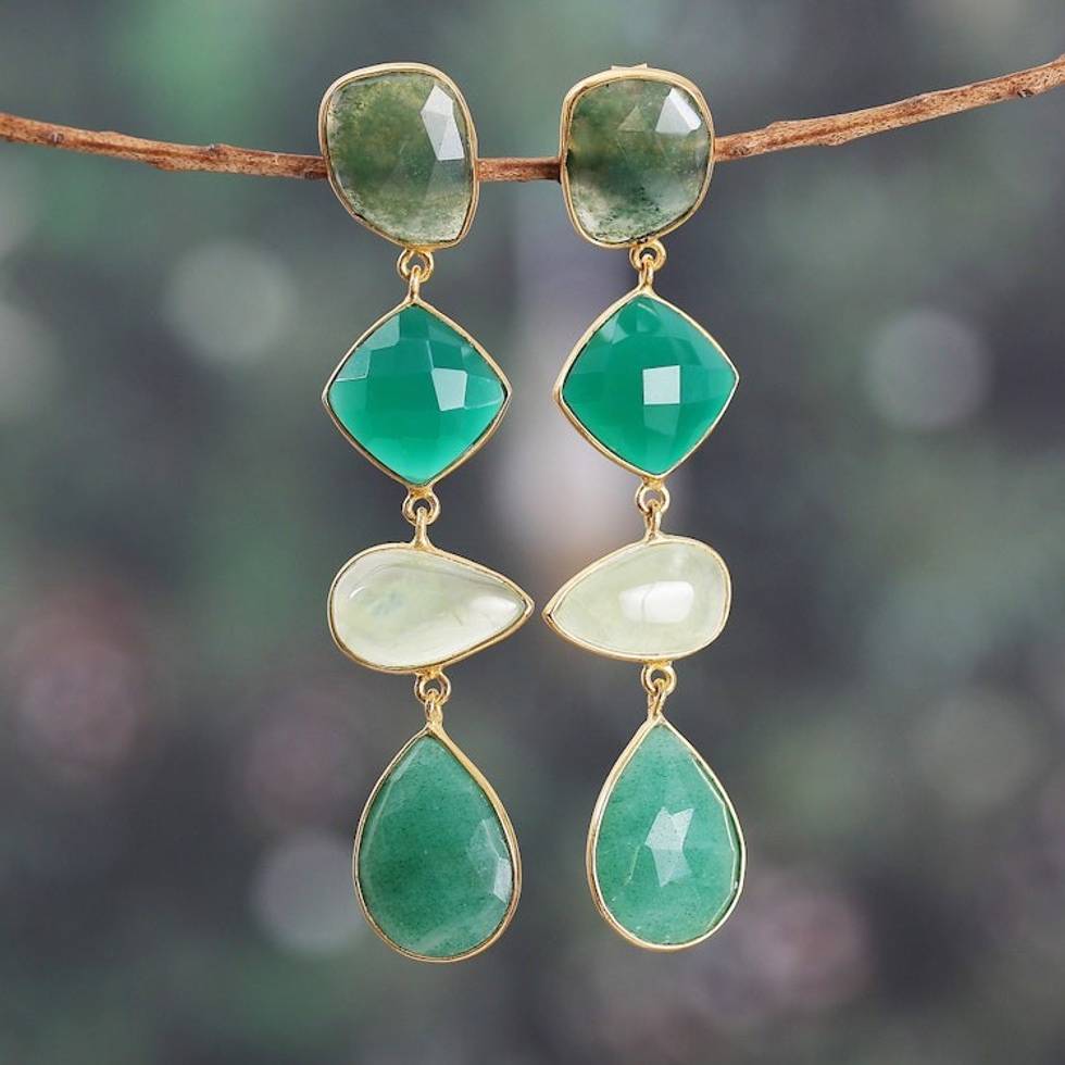 Gold-Plated Green 60-Carat Multi-Gemstone Dangle Earrings 'Green Quartet' Item ID: 2671781985