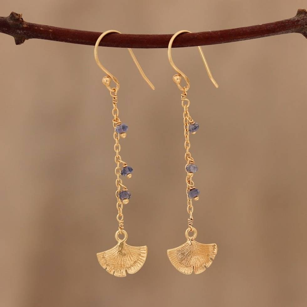 Gold Plated Iolite Ginkgo Leaf Dangle Earrings from India 'Ginkgo Hope' Item ID: 2669924445