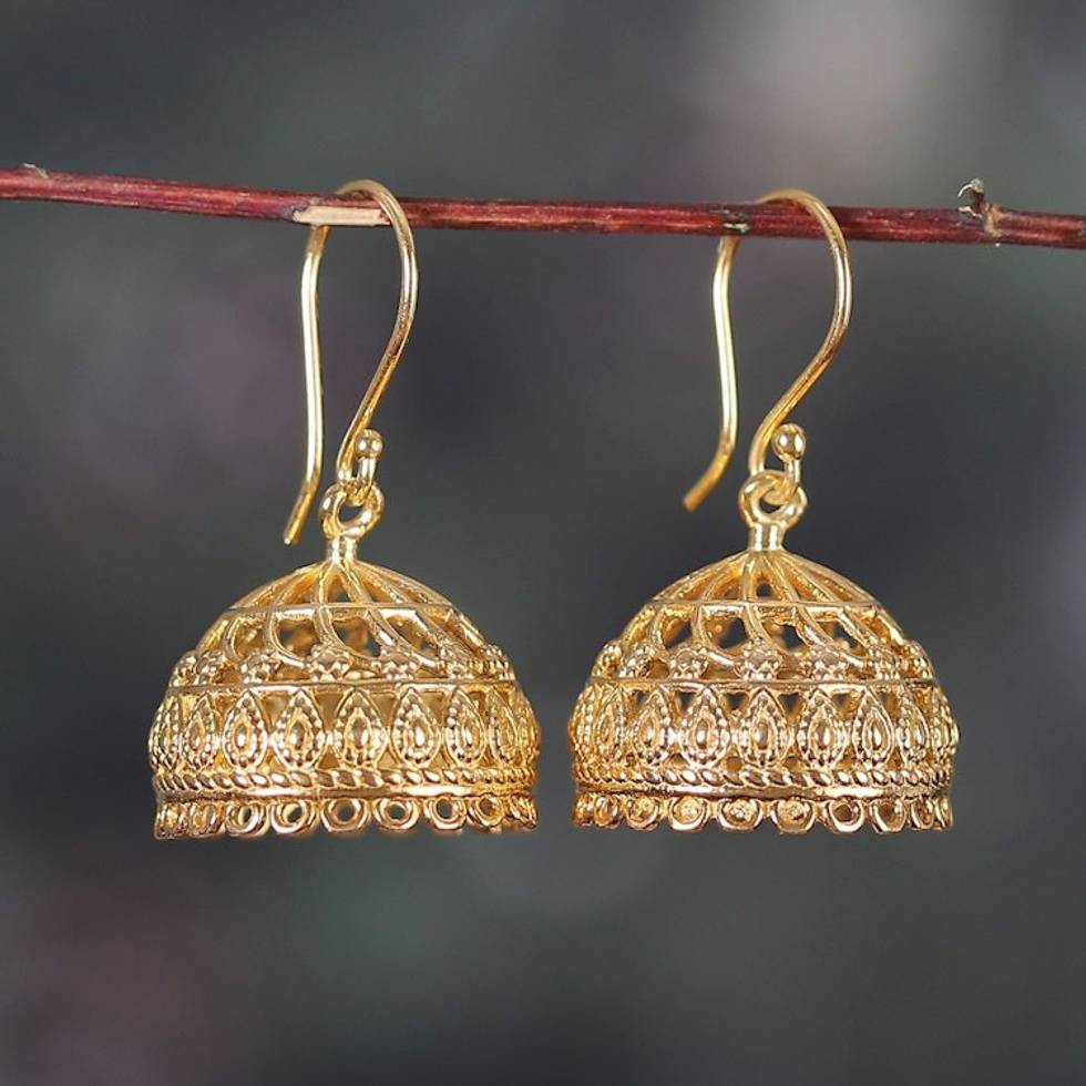Gold-Plated Jhumki Dome-Themed Dangle Earrings from India 'Radiant Jhumki' Item ID: 2671625425
