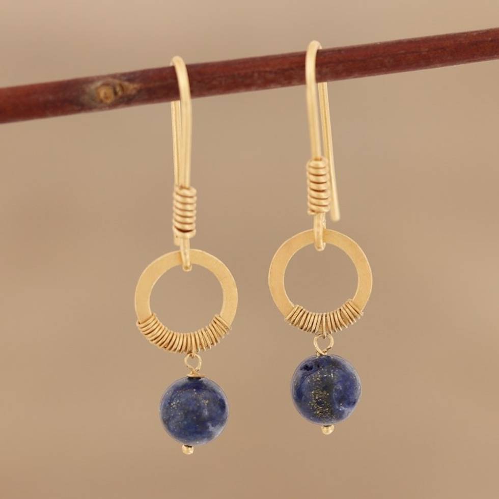 Gold Plated Lapis Lazuli Dangle Earrings from India 'Wrapped Rings' Item ID: 2669924510
