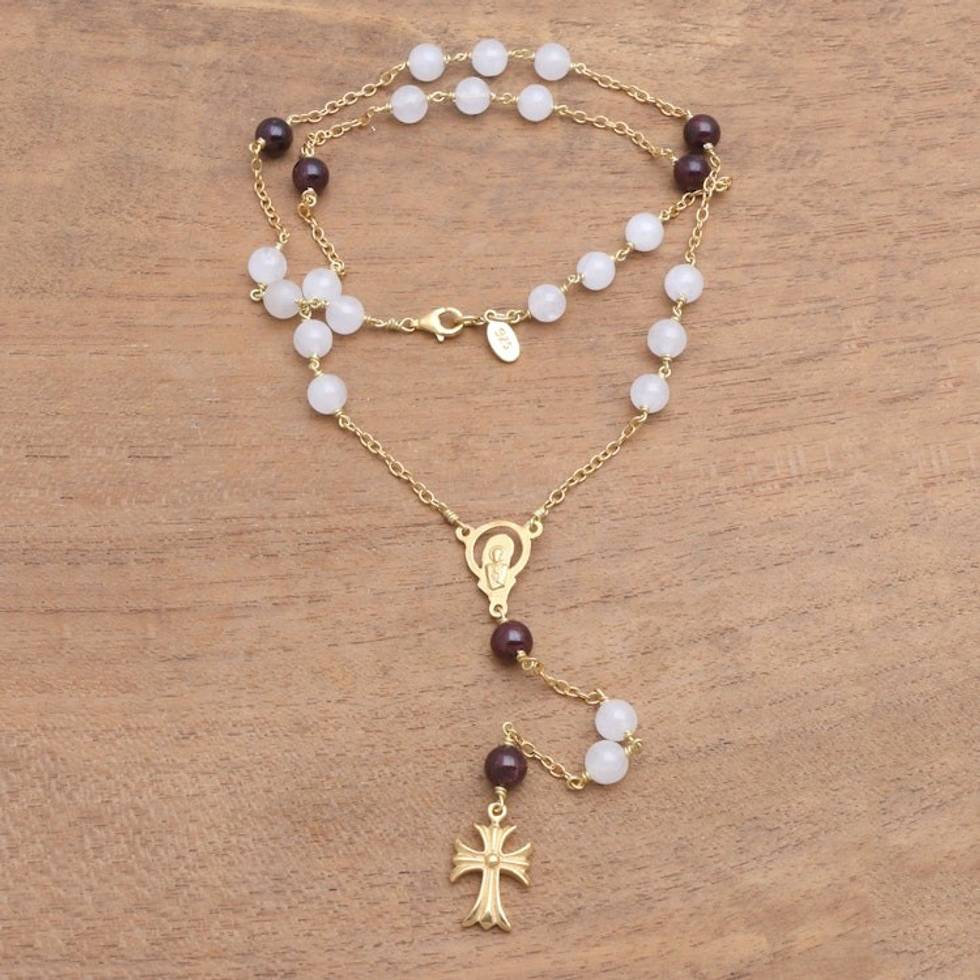 Gold Plated Moonstone and Garnet Rosary from Bali 'Delightful Faith' Item ID: 2671744887
